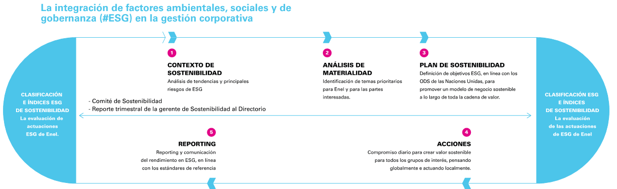 Enel cuenta con una estructura específica de gobernanza inspirada en las mejores prácticas internacionales y las integra a los diferentes procesos de toma de decisiones y a sus operaciones a lo largo de toda la cadena de valor.