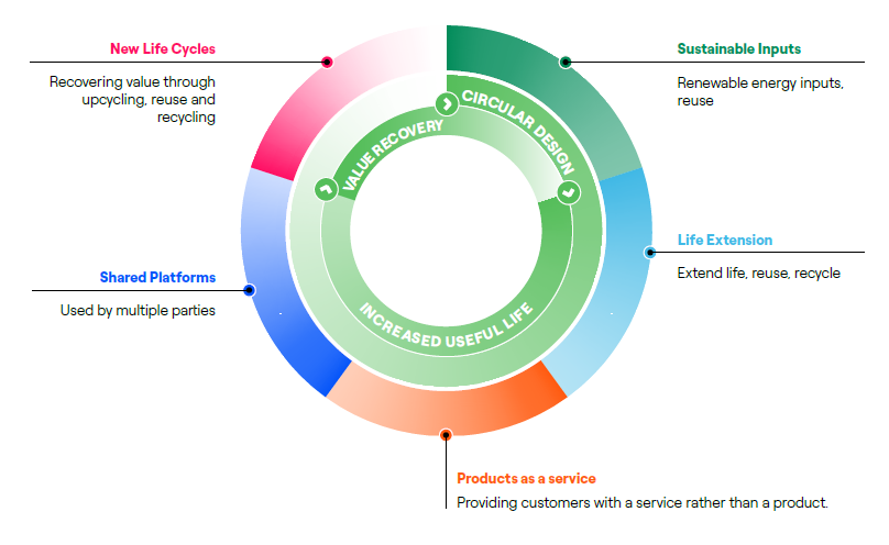 • New life cycles: incorporating new solutions such as reuse, repair, upcycling, remanufacturing, and recycling once the useful life of the goods is over, creating new opportunities to recover and recirculate materials.