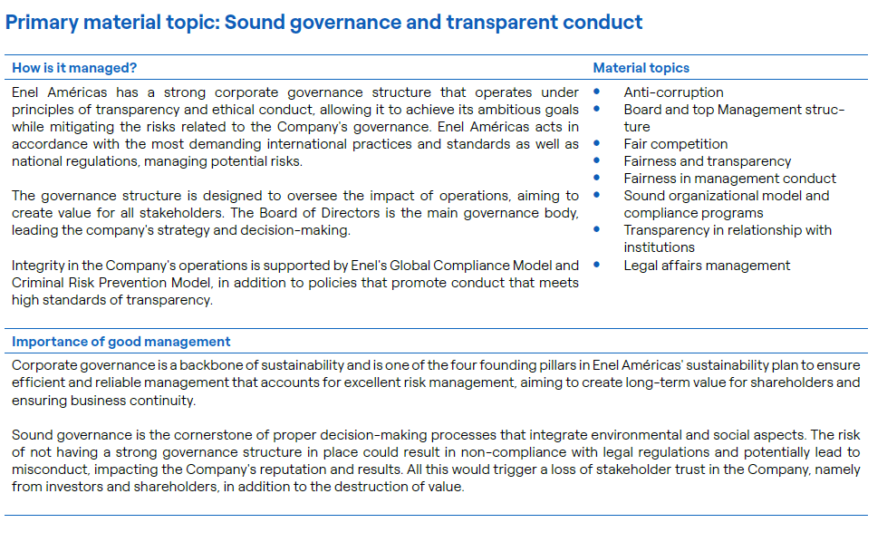 The duties related to sustainability, including climate change, were delegated to the Enel Américas Directors' Committee by the Board of Directors.