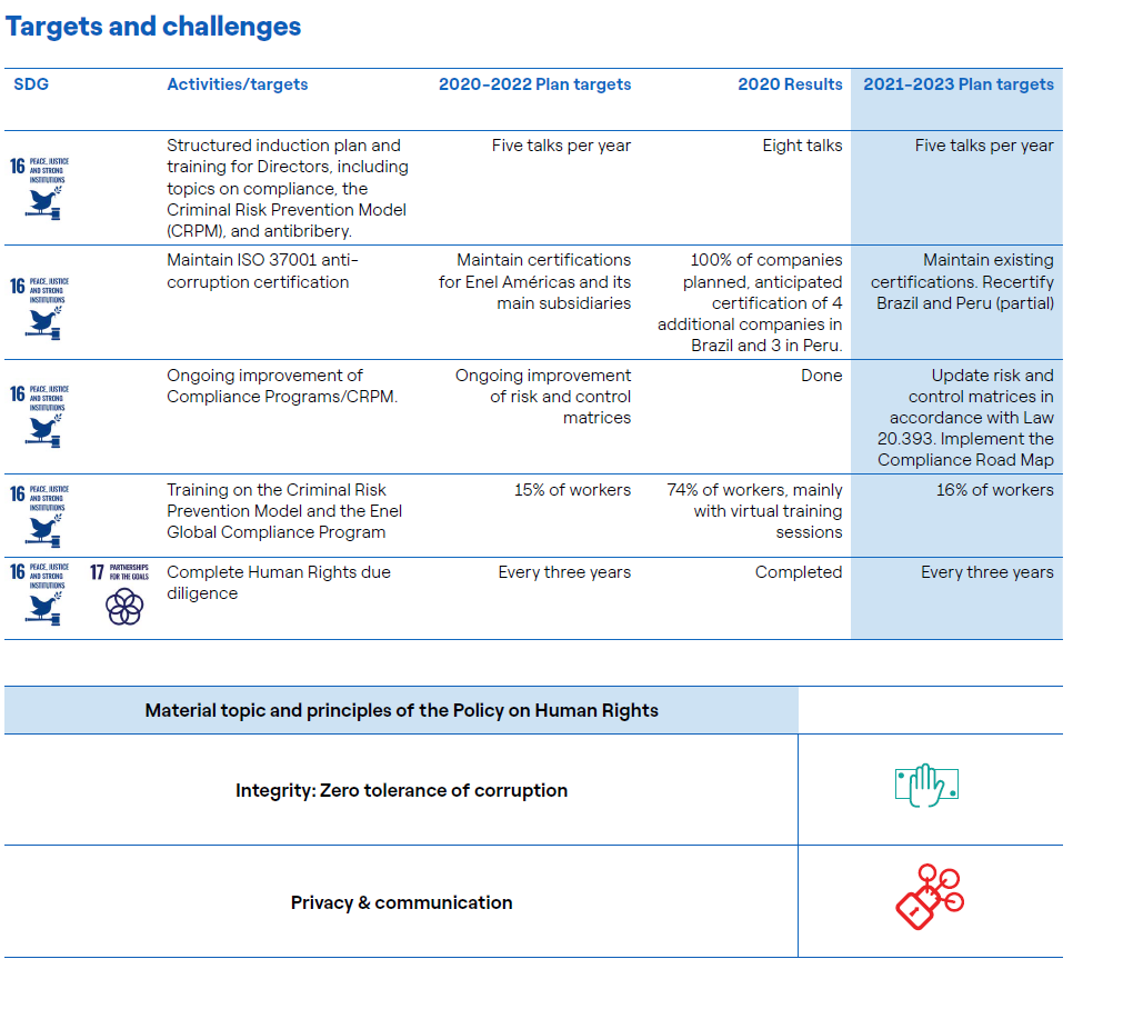 ISO 37001 Anti-Bribery Management System Certification for Enel Brasil, ED Ceará, ED Rio de Janeiro, ED Goiás, ED Sao Paulo, Enel X Brasil, CIEN, and CGTF (Brasil), Enel Generación Piura, Chinango S.A.C, and Enel X Perú S.A.C. (Peru). Recertification of the Anti-Bribery Management System for Edesur (Argentina), Enel-Codensa and Enel-Emgesa (Colombia), Enel Distribución Perú, Enel Generación Perú, and Chinango S.A.C. (Peru).