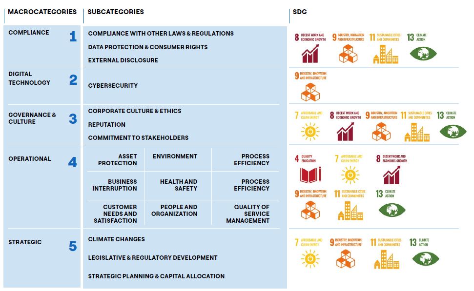Enel Américas is committed through its business strategy to six of the 17 Sustainable Development Goals (SDGs). The Company's risks are classified under six macro categories of the risk taxonomy, which are related to the ESG (environmental, social and governance) aspects of the business, and allow the contribution to the six priority SDGs: