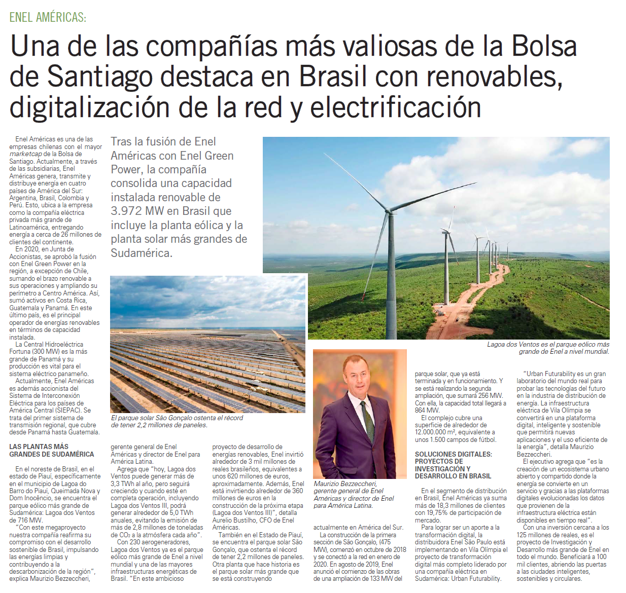 Following the merger of Enel Américas and Enel Green Power, the new company now has a consolidated renewable installed capacity of 3,972 MW in Brazil, including the largest wind plant and the largest solar plant in South America.