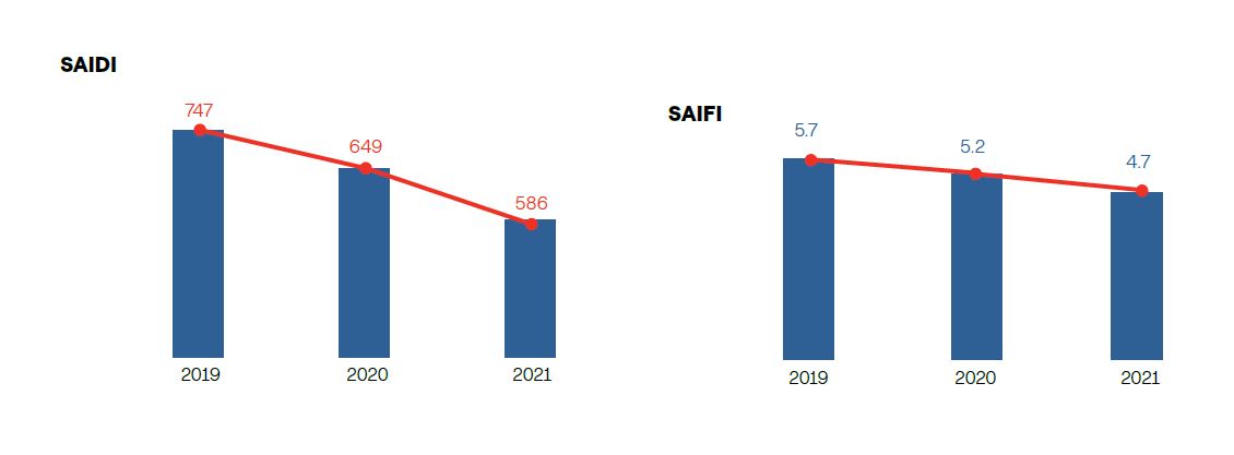 In 2021, the Company continued to develop initiatives that had a direct impact on operational excellence, safeguarding network efficiency and ensuring supply continuity. This is reflected in the evolution of the graphs of the indicator representing the interruption time per customer over a 12-month period, the System Average Interruption Duration Index (SAIDI), and indicator of the interruption frequency over a 12-month period, the System Average Interruption Frequency Index (SAIFI), which are both published below: