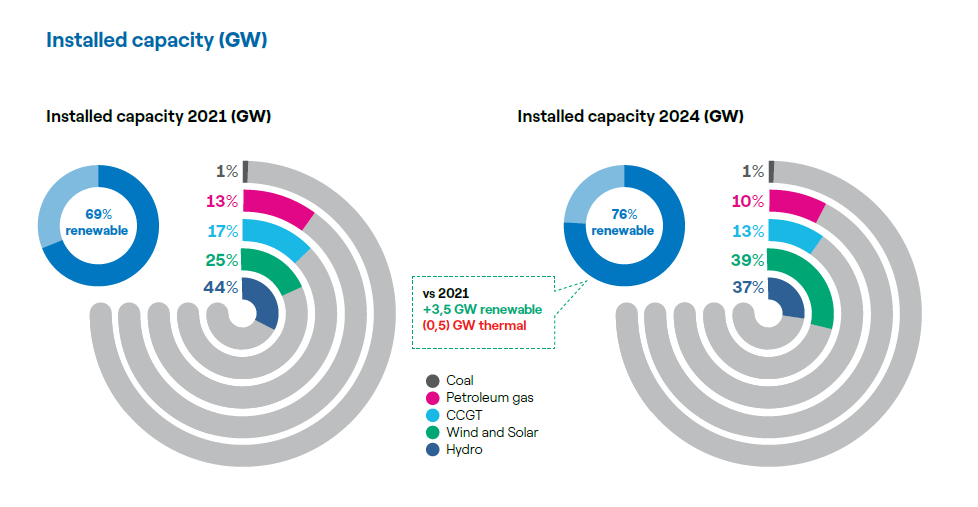 The 2022–2024 Strategic Plan seeks to incorporate 3.5 GW of new renewable capacity while simultaneously decommissioning 0.5 GW of thermoelectric capacity, reaching a total capacity of 19 GW in 2024 with 14.5 GW—equivalent to 76%—from renewable sources.