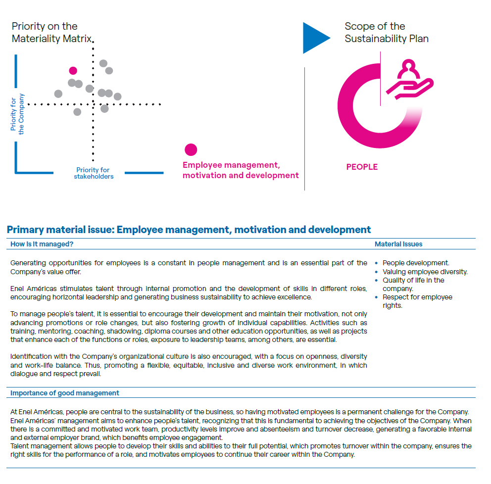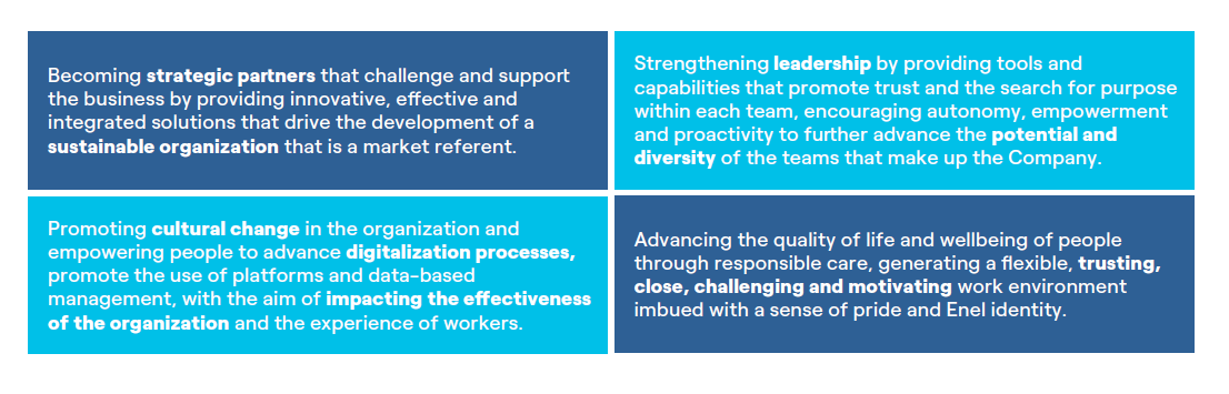 Enel Américas promotes a culture based on diversity, inclusion, and the importance of people, recognizing them for their merits and enabling their growth and expression of talent. To meet this goal, people management has been focused on four objectives: