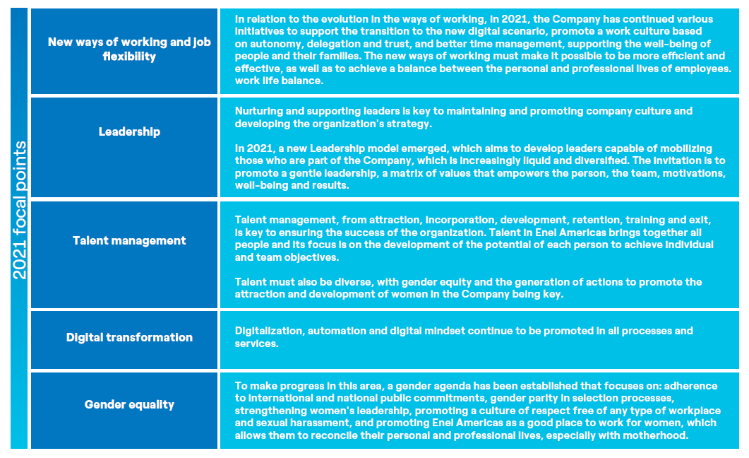 These four key objectives are translated into initiatives, programs and processes that cross the entire value chain of people, providing the tools and solutions required by Enel Americas’ employees. During 2021, the people strategy was promoted through the following management focal points: