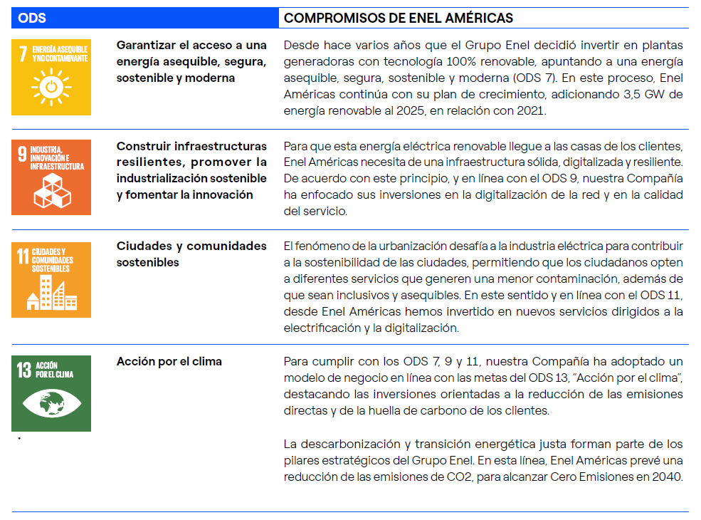 Todo lo anterior refleja la manera en que Enel Américas se empeña en entregar valor a sus accionistas, a todos sus grupos de interés, y a la sociedad en general. A través de nuestro negocio, contribuimos a las metas de los Objetivos de Desarrollo Sostenible relacionados con la innovación, infraestructura, ciudades y comunidades sostenibles, los cuales a su vez están intrínsecamente vinculados con la acción y el respeto por el clima.