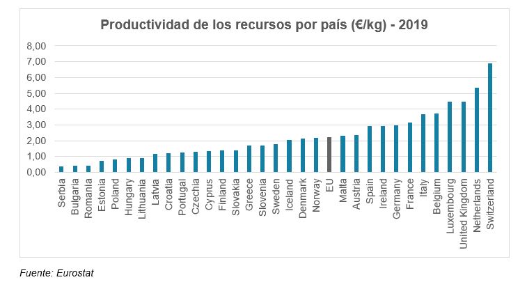 A nivel europeo, la Comisión Europea introdujo en el 2013 el EU Resource Efficiency Scoreboard, estableciendo 32 indicadores para monitorear la eficiencia con la cual los países miembros consumen sus recursos. El indicador principal es la productividad de los recursos, medido como el Producto Interno Bruto sobre el consumo interno de materias primas, lo que indica de forma muy concisa la capacidad de un país de generar valor por unidad de material extraído del planeta. El Eurostat reporta, por ejemplo, un productividad del recurso de la Unión Europea en torno a 2,22 €/kg para el 2019.