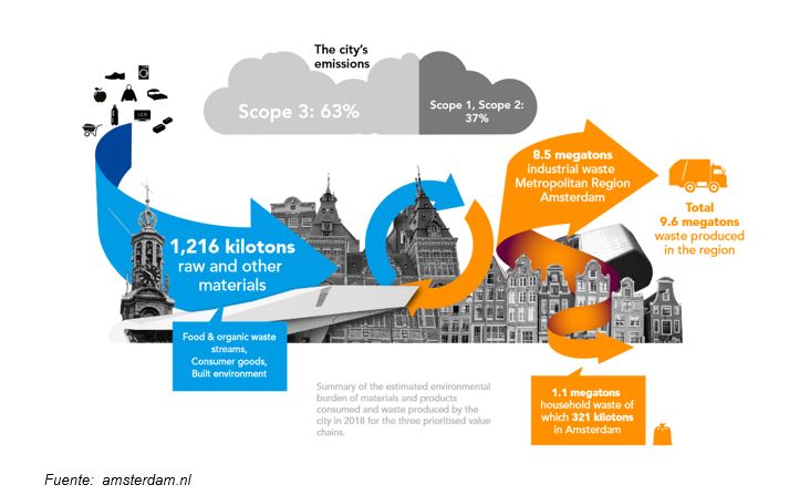A nivel de ciudad, Ámsterdam, en el marco de su estrategia 2020-2025, está desarrollando un sistema de monitoreo para determinar al avance de la transición circular en términos de flujos de materiales, emisiones y costos ambientales de tres cadenas del valor: residuos orgánicos y de alimentos, bienes de consumo y entorno construido. Los resultados preliminares dan cuenta, entre otros, que la ciudad en el 2018 consumió un total de 1216 kt de materiales, con un impacto estimado en 1346 kt CO2 y un costo ambiental de 418 M€.