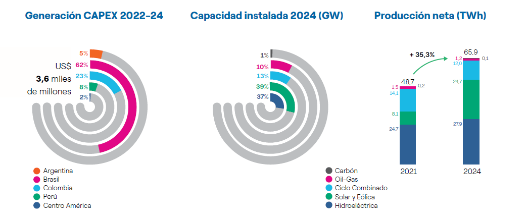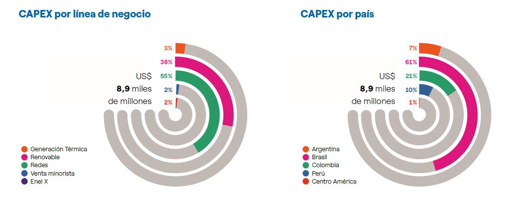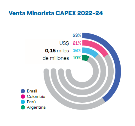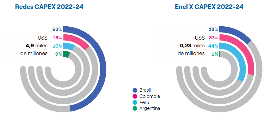 Por otra parte, la infraestructura de red de distribución y transmisión desempeñan un papel central en la transición energética como facilitador de la electrificación. Es por ello, que se destinara el 55% del CAPEX 2022- 2024 a nuevas conexiones y la digitalización de la red, que permitirá no solo aumentar el acceso a energías limpias, sino que también la confiabilidad de la red, aspectos claves que permitirá los clientes gestionar sus propios consumos actuando siempre más como un consumidor más activo y participe de las dinámicas del mercado eléctrico. El camino hacia la transición energética también es apoyado por la línea de negocios Enel X, la cual tiene como estrategia ofrecer una cartera de servicios integrados, con una visión más allá del valor único del Community. Dicho esto, en el periodo 2022-24 se espera invertir alrededor de US$230 millones a través de esta línea, con una fuerte presencia en Perú y Colombia.
