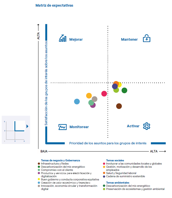 A partir de las encuestas directas a los grupos de interés, complementadas con fuentes secundarias de información, se identifica la prioridad y el nivel de satisfacción de cada tema material para cada uno de ellos. Los resultados obtenidos, permite generar una visión general de las expectativas de los grupos de interés, e identificar los temas en los que la empresa debe centrar su estrategia.