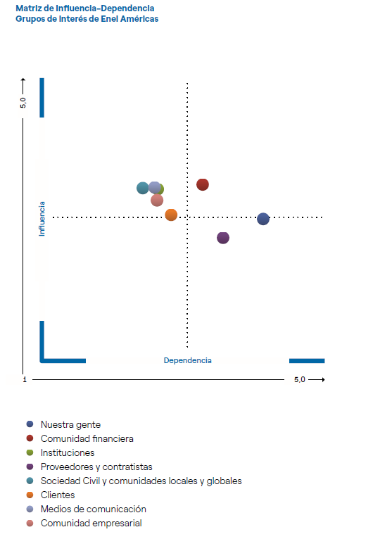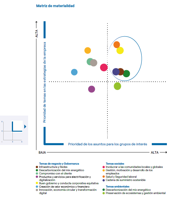 La Matriz de Materialidad elaborada por Enel Américas da cuenta de los temas prioritarios para los grupos de interés y estratégicos para la Compañía. Esta no solo es la base para definir los temas a abordar en el Informe de Sostenibilidad, sino que guían los focos de trabajo de toda la Compañía.