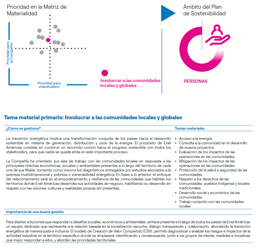 La transición energética se presenta como una gran oportunidad para avanzar hacia un desarrollo sostenible y hacer frente al cambio climático. Sin embargo, este debe ser administrada con una mirada inclusiva que considere las variables económicas, sociales y ambientales a lo largo de todo el proceso, con el objetivo de no dejar a nadie atrás y de garantizar que sus beneficios alcancen a todos las partes interesadas. Es indispensable que las comunidades sean actores protagónicos en esta transformación. Por ello, el principal foco de la estrategia de relacionamiento comunitario de Enel Américas ha sido acompañar a las comunidades locales en el recorrido de la transición energética, velando por que esta sea justa e inclusiva.