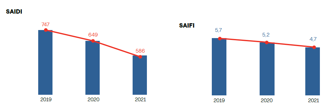 En 2021, se dio continuidad al desarrollo de iniciativas que incidieron de manera directa en la excelencia operacional, salvaguardando la eficacia de la red y asegurando la continuidad del suministro. Esto se refleja en la evolución de las gráficas del indicador que representa el tiempo de interrupción por cliente en un período de 12 meses -System Average Interruption Duration Index (SAIDI)- y en el indicador de frecuencia de la interrupción del suministro de energía en un período de 12 meses o System Average Interruption Frecuency Index (SAIFI), que se publican a continuación: