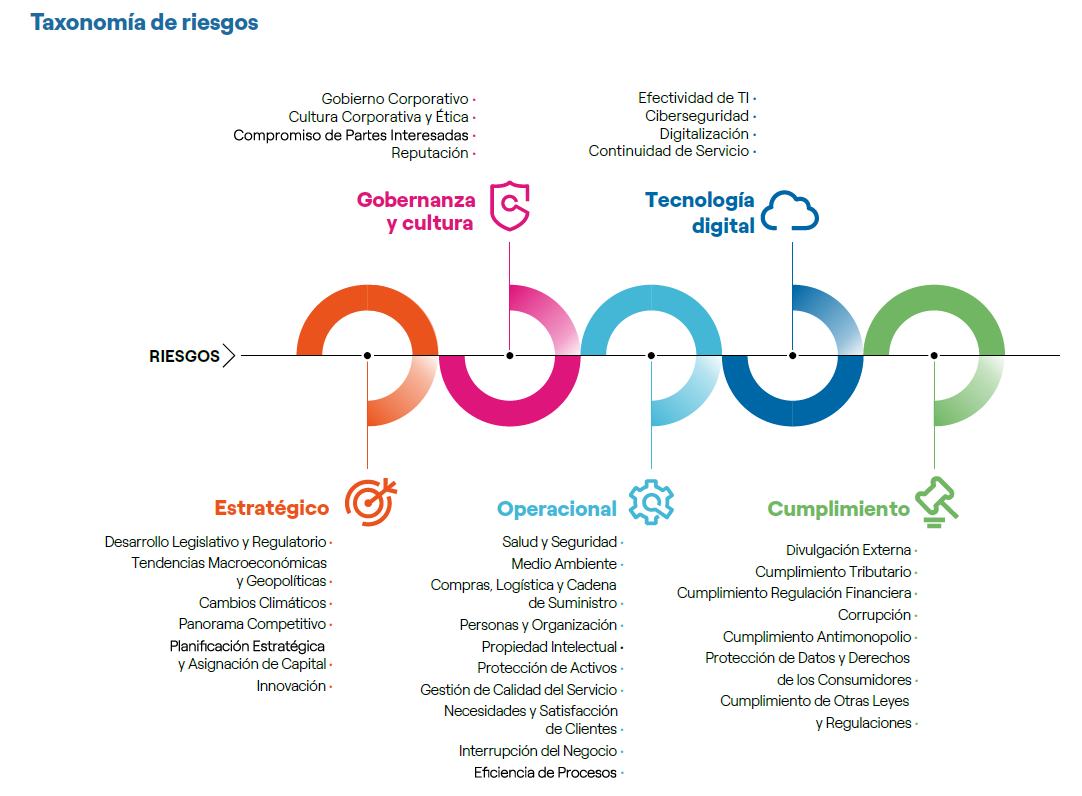 La Compañía busca protección para todos los riesgos que pueden afectar el logro de los objetivos del negocio. En enero de 2020, se aprobó una nueva taxonomía de riesgos para todo el Grupo Enel, con seis macro categorías Estratégicos, Gobernanza y Cultura, Cumplimiento, Financieros, Operacionales y Tecnología Digital y y 37 subcategorías e incorpora los riesgos ASG.