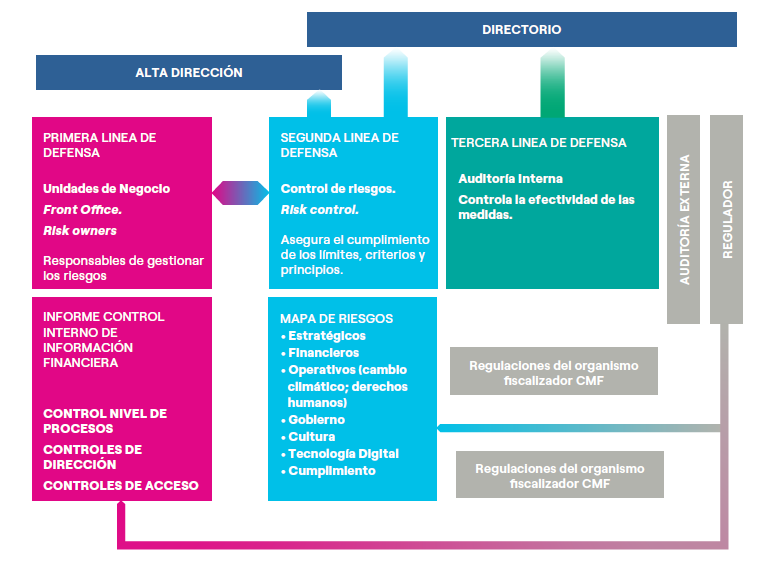 Para asegurar la efectividad del Sistema de Control Interno y de Gestión de Riesgos (SCIGR), se ha definido un modelo de tres niveles de acción, denominado de tres líneas de Defensa, que segrega las funciones. Las dos primeras líneas de defensa tienen la responsabilidad de la contención y reportan a la administración, mientras que la tercera lo hace al Comité de Directores conforme a las mejores prácticas internacionales de Gobierno Corporativo.